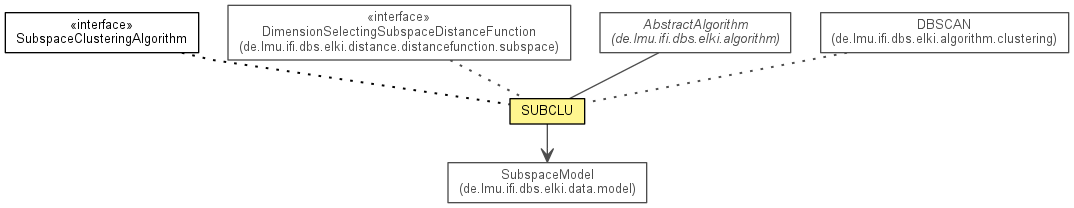 - the type of FeatureVector handled by this Algorithm@Title(value="SUBCLU: Density connected Subspace Clustering") @Description(value="Algorithm to detect arbitrarily shaped and positioned clusters in subspaces. SUBCLU delivers for each subspace the same clusters DBSCAN would have found, when applied to this subspace seperately.") @Reference(authors="K. Kailing, H.-P. Kriegel, P. Kr\u00f6ger", title="Density connected Subspace Clustering for High Dimensional Data", booktitle="Proc. SIAM Int. Conf. on Data Mining (SDM\'04), Lake Buena Vista, FL, 2004", url="http://www.siam.org/meetings/sdm04/proceedings/sdm04_023.pdf") public class SUBCLU<V extends NumberVector> extends AbstractAlgorithm<Clustering<SubspaceModel>> implements SubspaceClusteringAlgorithm<SubspaceModel>