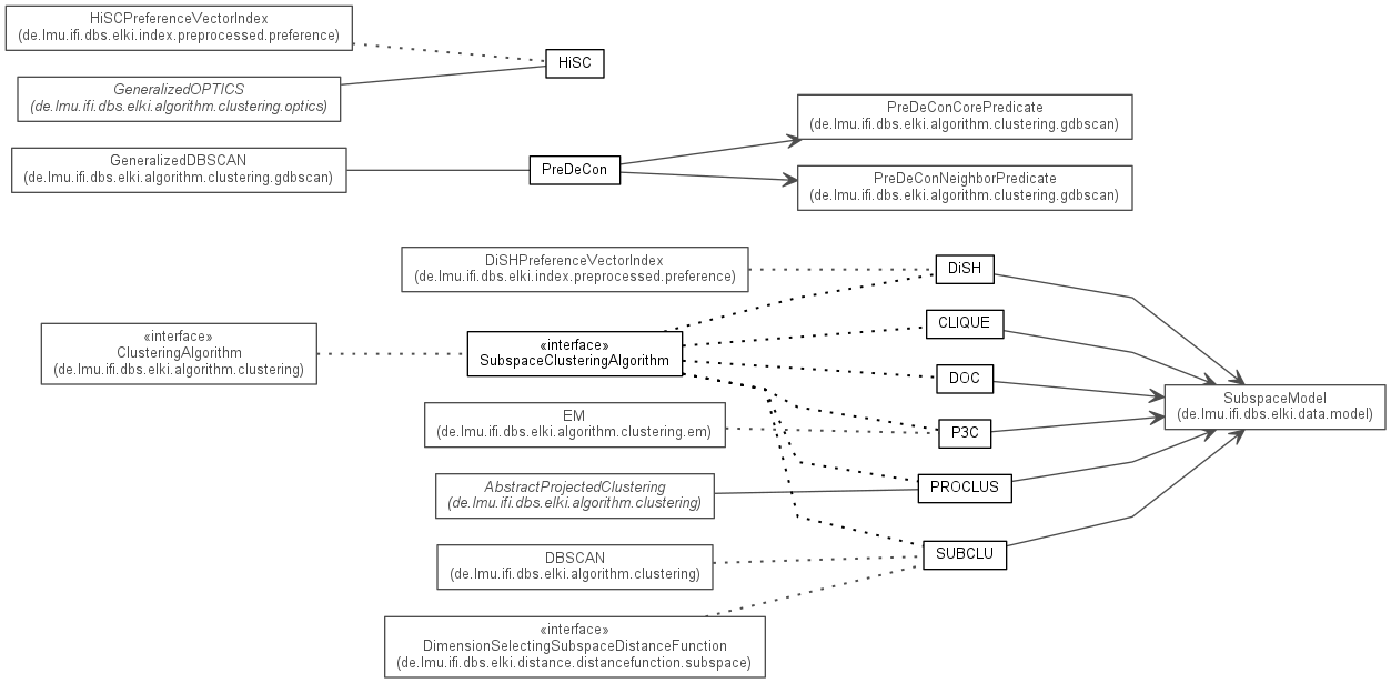 The clustering algorithms in this package are instances of both, projected clustering algorithms or subspace clustering algorithms according to the classical but somewhat obsolete classification schema of clustering algorithms for axis-parallel subspaces.Copyright © 2014 ELKI Development Team, Lehr- und Forschungseinheit für Datenbanksysteme, Ludwig-Maximilians-Universität München. License information.
