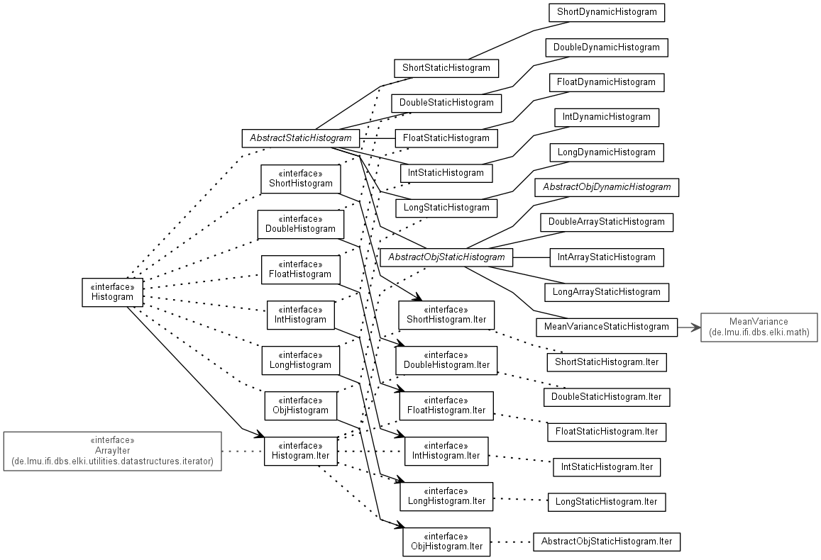 This package contains two families of histograms. Static histograms have a fixed initial number of bins. When encountering values outside of their range, they will grow similar to an ArrayList by adding additional bins. "Dynamic" histograms are more useful when you do not know the value range of the data: they start by collecting a number of sample data, then use this to estimate the initial histogram range. If they grow to twice their initial size they will downsample, to keep the histogram size in the bounds n to 2n-1, which effectively limits the memory use and histogram complexity.Copyright © 2014 ELKI Development Team, Lehr- und Forschungseinheit für Datenbanksysteme, Ludwig-Maximilians-Universität München. License information.