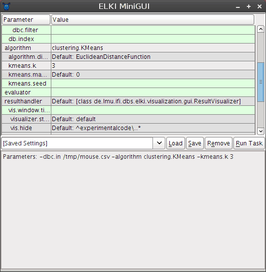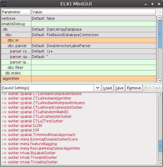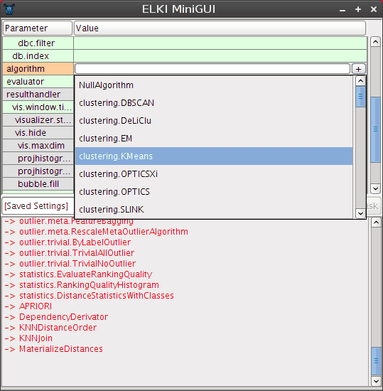 Settings are saved in the file MiniGUI-saved-settings.txt that you should find easily editable with any text editor. Individual entries are separated with an empty line, and the first line of each section is the title of the setting, while the remaining lines give the options. The syntax is that of the ELKI command line interface, for easy batch operation.