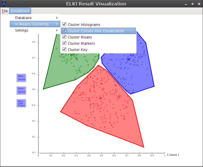 To get a more visual impression of the cluster shapes, we can go to the menu and enable the "Cluster Convex Hull Visualization" module for this clustering result: